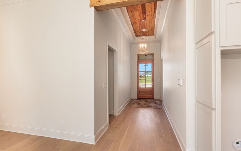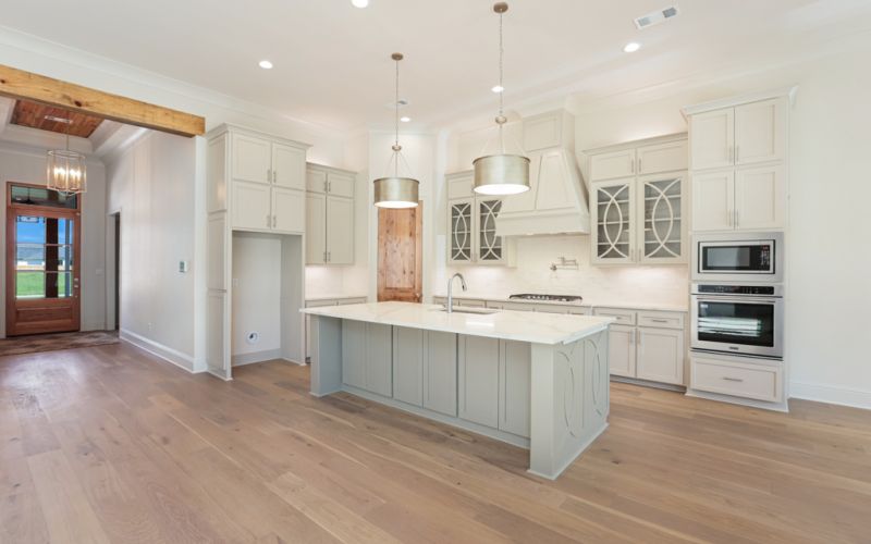 The home has the same inlaid wood features, colorful mix of patterned tile and decorative bold lighting package as you’ve come to love in all of Clayton’s homes.   What’s different about this four bedroom, three bath home is the addition of an office and a half bath. You’ve asked and we’ve been listening! The front porch wrap gives space for welcoming guest out of the rain and provides enough space for decorative pieces and potted plants. The extended foyer entrance into the home provides privacy into the living areas and entry to the two front bedrooms. The kitchen has a quartz island with storage drawers, sliding spice pull out drawers on both sides of the gas cooktop and a pot filler. You will find additional storage in the corner pantry and the second counter with additional cabinets for a coffee station or wine bar. The glass tiled backsplash sets the tone for the glamour of your dishes behind the custom cabinets with glass enclosures. There's also overhead and under mount lighting.